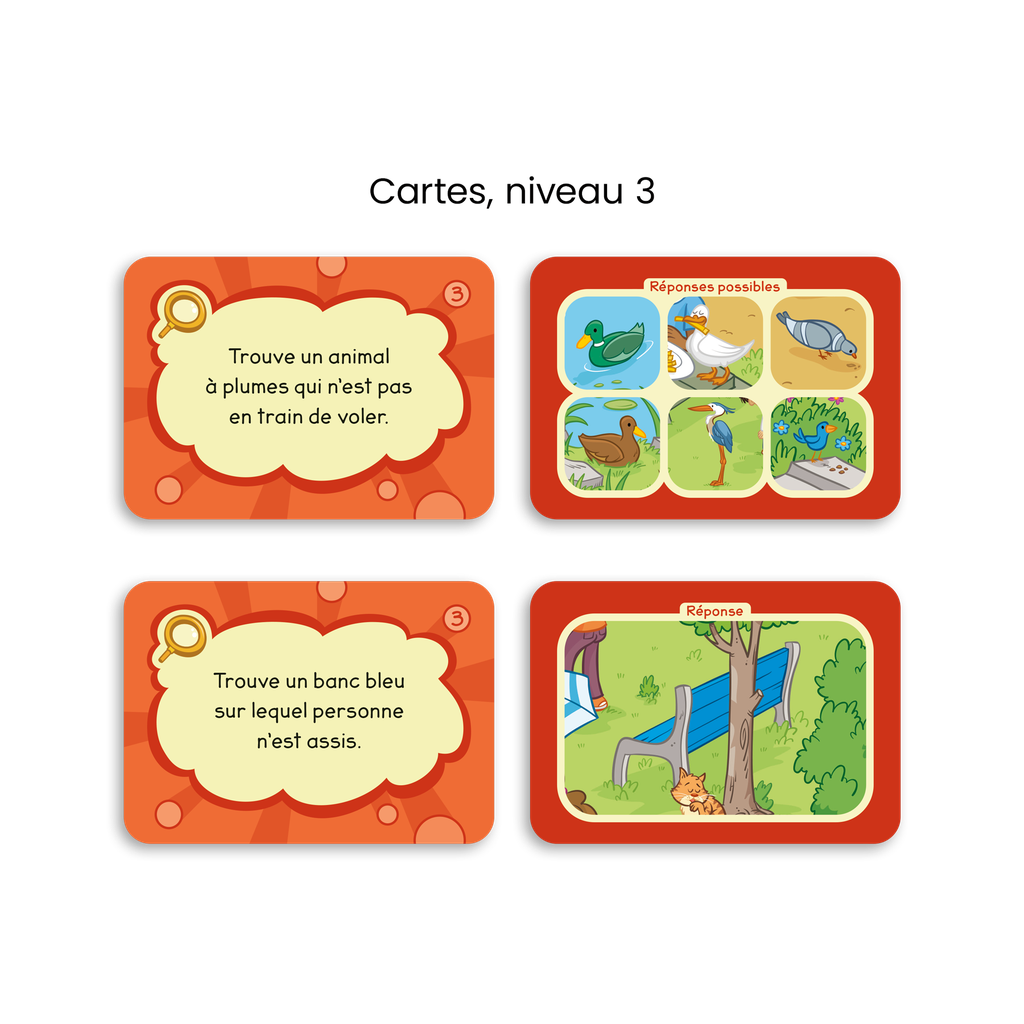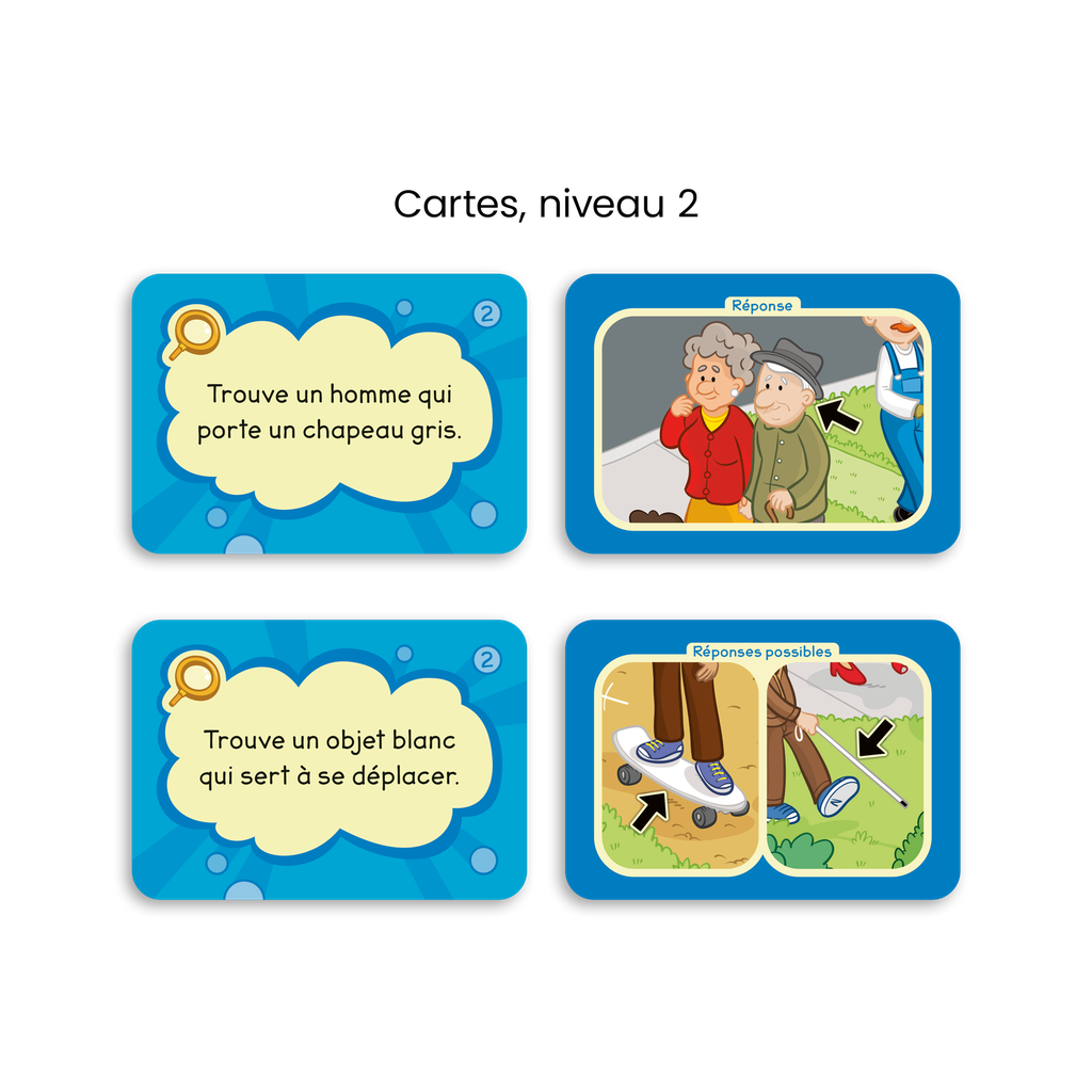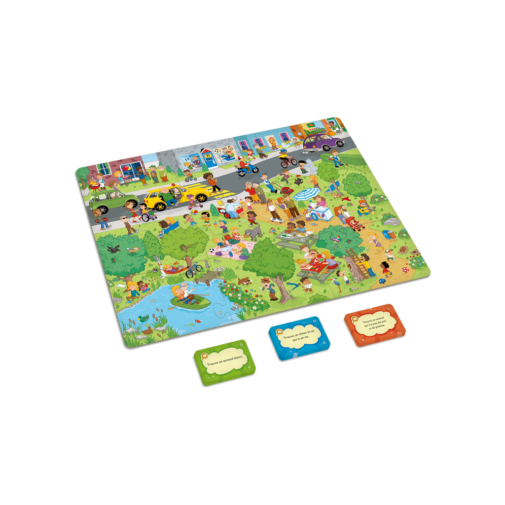 Trouve un animal blanc! Trouve un objet bleu qui sert à s'assoir! Trouve un aliment jaune qui n'est pas un fruit! Écoute bien les consignes et sois le plus rapide à trouver les éléments sur la planche de jeu.