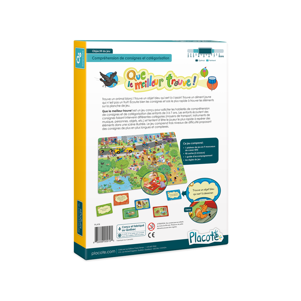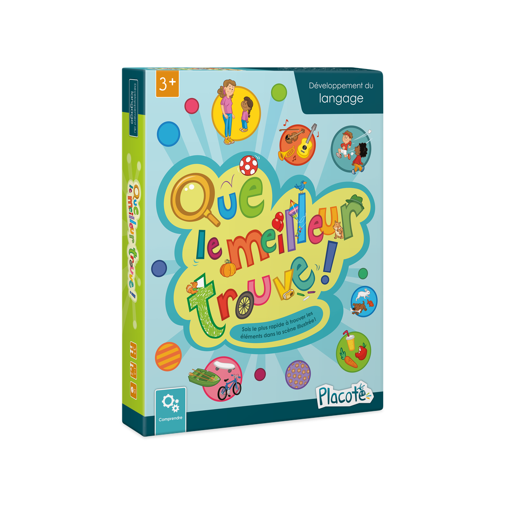 Que le meilleur trouve! est un jeu conçu pour solliciter les habiletés de compréhension de consignes et de catégorisation des enfants de 3 ans à 7 ans. Les enfants écoutent des consignes faisant intervenir différentes catégories (moyens de transport, instruments de musique, personnes, objets, etc.) et tentent d'être le joueur le plus rapide à repérer des éléments dans une scène illustrée. Le jeu comprend trois niveaux de difficulté proposant des consignes de plus en plus longues et complexes.