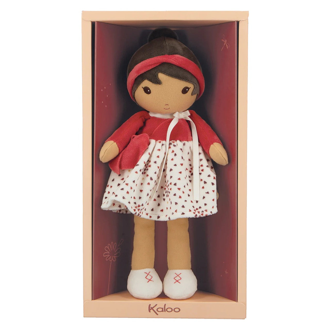 La poupée en tissu Émilie de Kaloo (25 cm) est fabriquée en micro-velours recyclé, offrant une douceur et une légèreté adaptées aux petites mains. Son design romantique avec une jupe à volants ornée de cœurs et un bandeau rouge assorti reflète une ambiance joyeuse. Livrée dans une élégante boîte cadeau personnalisable avec un ruban, cette poupée répond aux normes de sécurité européennes et est lavable en machine à 30°C, garantissant hygiène et durabilité.